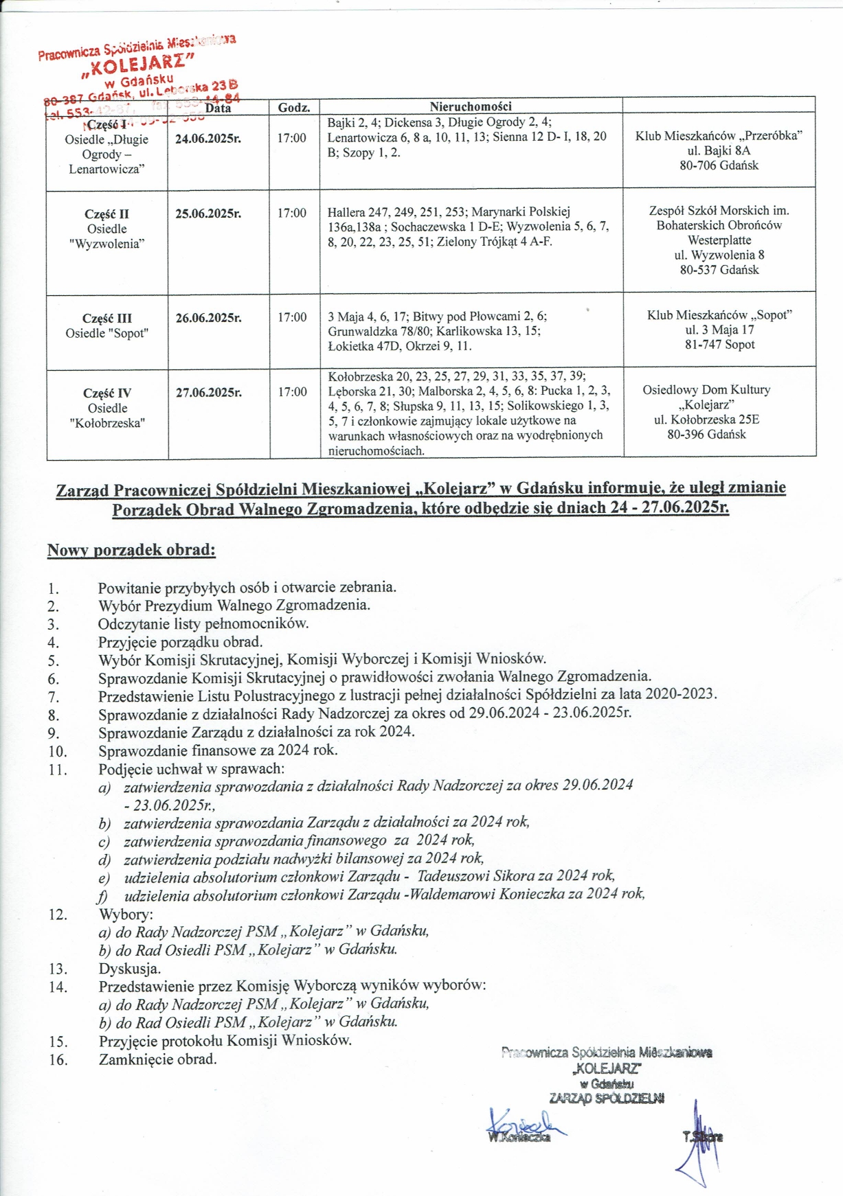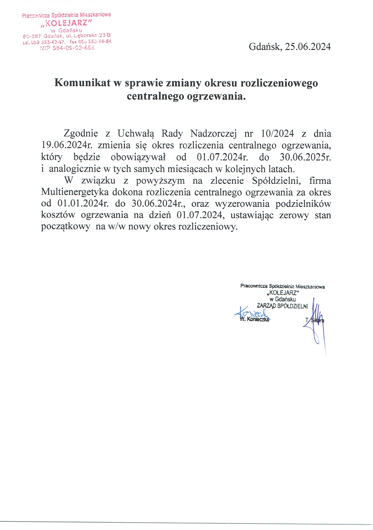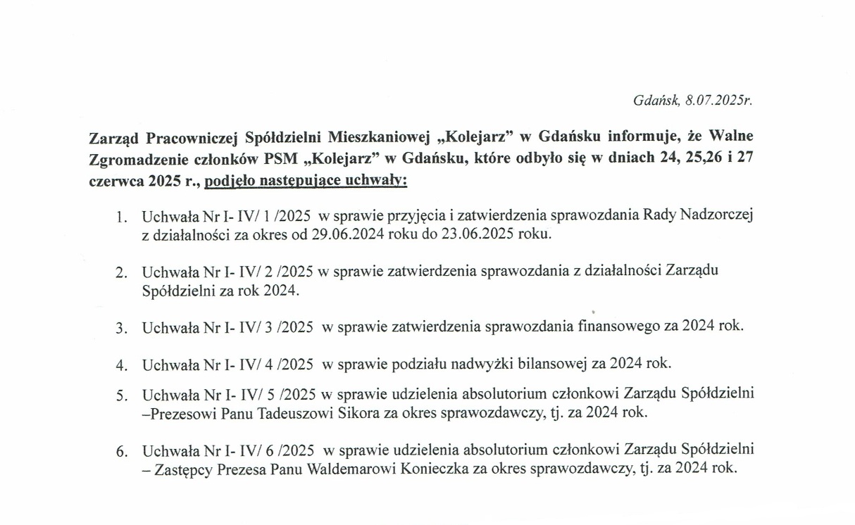 Zarząd PSM „Kolejarz” w Gdańsku informuje,